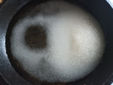 Поставьте сотейник с толстым дном на средний огонь. Насыпьте в сковороду сахар, налейте воду. Не переставая мешать, нагревайте воду до тех пор, пока кристаллики сахара полностью не растворятся. Теперь снимите полученный сироп с огня.