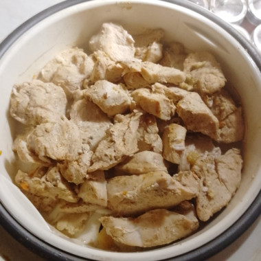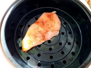 На свой страх и риск грудку посолила перед приготовлением. А так же натерла паприкой и карри. Оставила мариноваться на 15 минут. Тем временем налила в чашу мультиварки горячую воду, взяла 300 мл. с запасом. В воду по совету автора положила лавровый лист и пару горошков душистого перца. Готовила курочку 25 минут на пару. Готовность определила проткнув мясо ножом. Оно было уже мягким и к тому же выделился прозрачный сок.