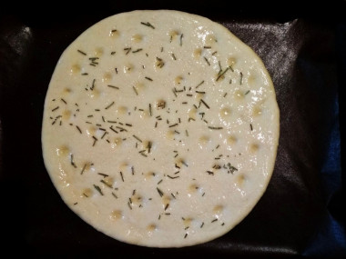 Посыпьте фокаччу крупной морской солью и иголочками розмарина. Вместо свежего вы можете использовать и сухой.