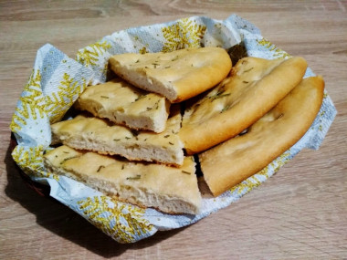 Купила пакет итальянской муки, такую раньше никогда не покупала. Захотелось испробовать её, и рецепт итальянской лепешки фокачча показался мне подходящим. Отвесила необходимое количество ингредиентов. Часть муки (около 100 г) отложила в сторонку, чтобы подсыпать во время замеса понемногу, и не зря, так как моя новая мука мощно впитывала влагу, тесто быстро становилось эластичным, и отложенные 100 г не пригодились вообще, даже для подпыла стола. На первом фото - тесто, которое получилось после замеса, до расстойки. После расстойки я разделила тесто на две части. Из первой с помощью скалки сформовала лепешку, из второй дочь налепила разных кренделей)) Смазала, посыпала, выпекала, как описано в рецепте. Получилось интересненько... Не пробовала никогда настоящую фокаччу, и даже не знаю, какой на вкус она должна была получиться. У меня вышла лепешка, хрустящая сверху и мягкая внутри, при этом она тонкая - примерно 1,5 см толщиной. Дочь сказала, что она очень похожа на пиццу, и на вкус, и по внешнему виду. Всем очень понравилась. Можно сверху тертым сыром присыпать. Спасибо за рецепт!