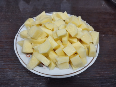 Нарежьте картофель средними кусочками, а луковицу и морковь - мелкими. Добавьте в кастрюлю.