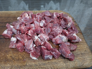 Говядину очистите от пленок и жил, тщательно промойте в проточной воде и нарежьте небольшими кусочками.