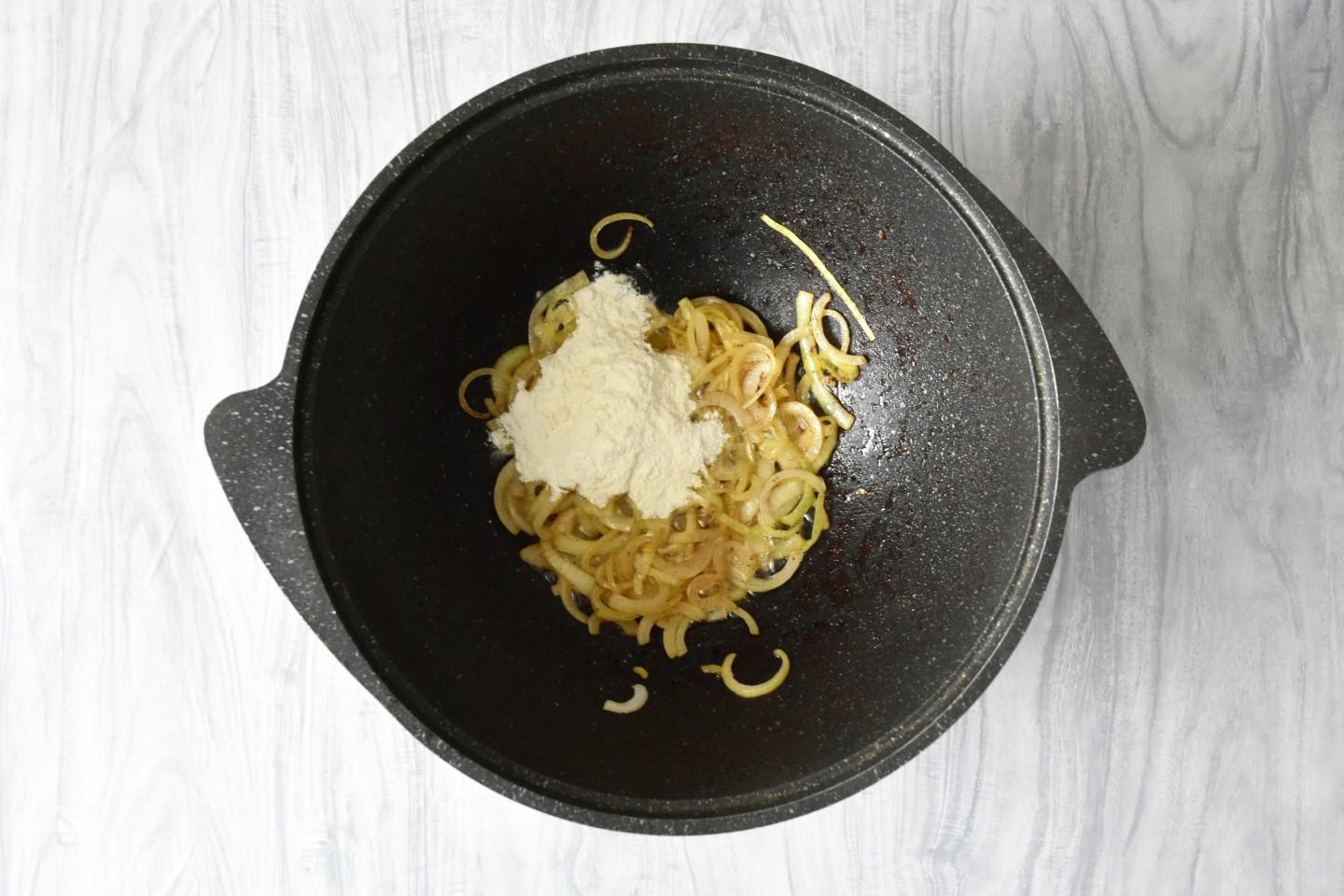 В казан добавьте оставшееся сливочное масло, лук и щепотку соли. Обжарьте, помешивая, примерно 5-7 минут. Огонь можете убавить до среднего, чтобы лук не подгорел. Всыпьте к луку муку и, помешивая, жарьте еще около 1-2 минут.