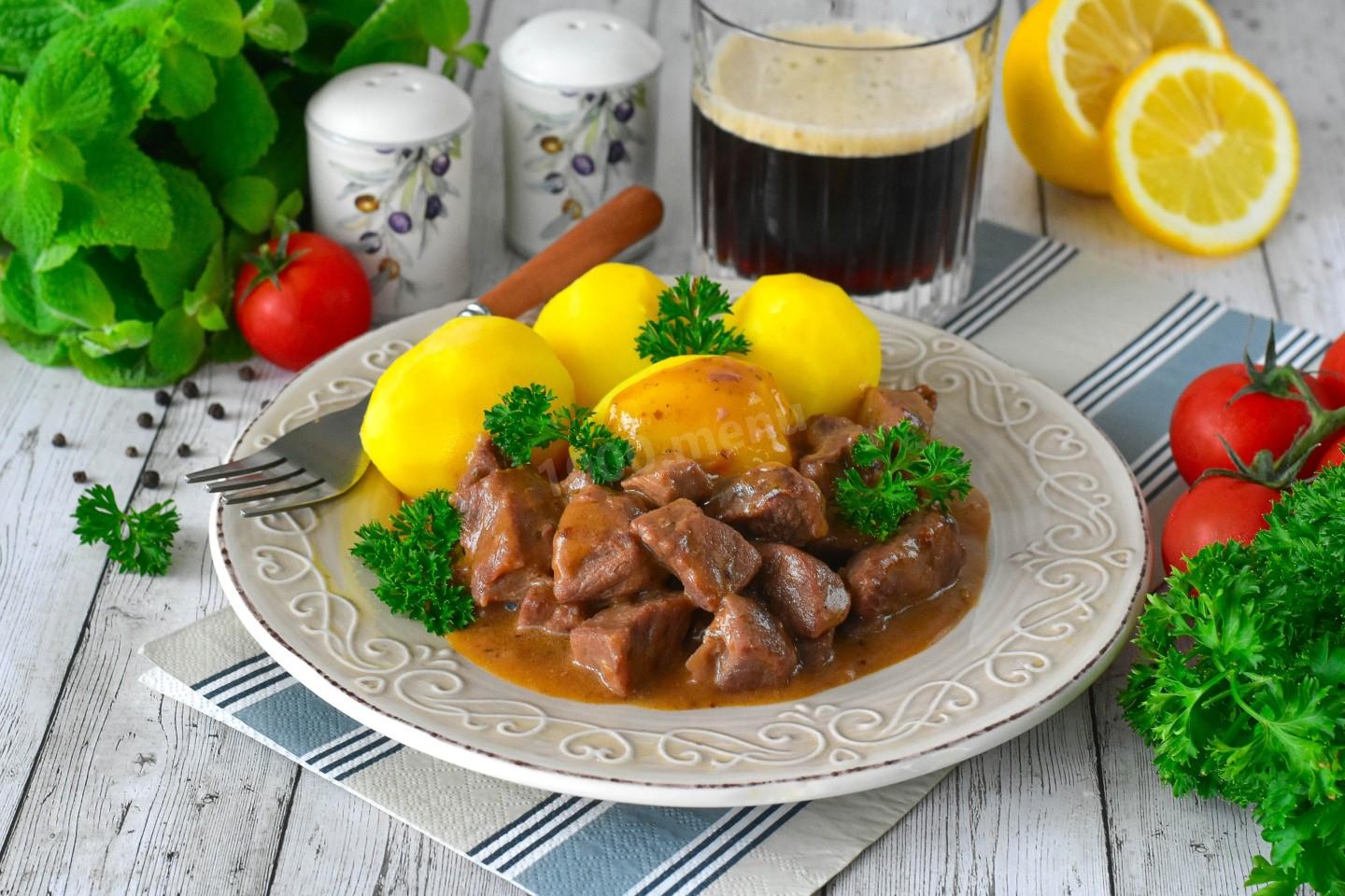 Блюда, где мясо тушится в пиве, особенно популярны в бельгийской, немецкой и британской кухне (например, бельгийский Carbonnade Flamande). Пиво в таких рецептах выступает не только маринадом, но и основой для насыщенного соуса, а его горечь и хмельные нотки идеально дополняют вкус жирного мяса.
