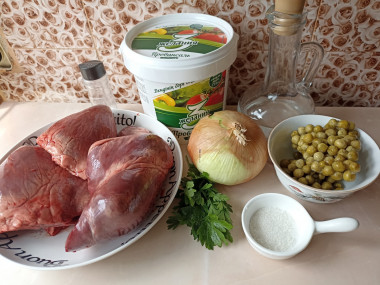 Как сделать Свиное сердце с луком? Сердце в салате используется отварное, лук - маринованный, зеленый горошек можно взять консервированный или замороженный, по желанию. Количество майонеза регулируйте по своему вкусу, можно положить меньше или больше. Такой салат не стыдно подать на праздничный стол, а также он вполне сгодится в качестве второго блюда на ужин для всей семьи. Гарнировать салат можно картошкой пюре , будет вкусно и сытно.