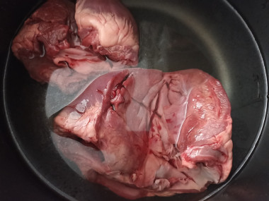 1. Итак, первым делом подготовьте свиное сердце. Вымойте его под проточной водой, обсушите бумажными полотенцами. Внимательно осмотрите, удалите все кровяные сгустки, которые могут быть в сердце, обрежьте жилки и пленочки, удалите лишний жир.