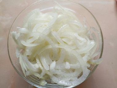 3. А тем временем очистите репчатый лук, нарежьте его полукольцами. Выложите лук в небольшую мисочку, полейте уксусом, посыпьте сахаром и добавьте щепотку соли. Перетрите лук руками, чтобы он пустил сок и дополнительные ингредиенты как можно равномернее распределились. Оставьте мариноваться на полчаса.