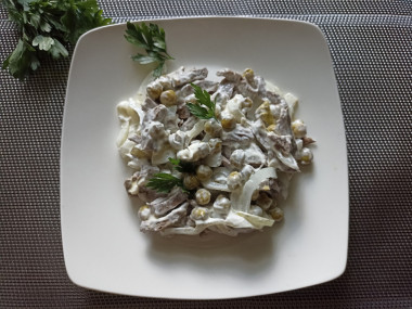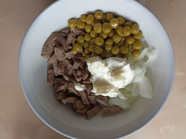 4. Отварное свиное сердце нарежьте тонкой соломкой, выложите в глубокую миску. Сюда же отправьте маринованный лук и зеленый горошек, добавьте майонез, перемешайте. Пробуйте на соль, если нужно, добавьте.