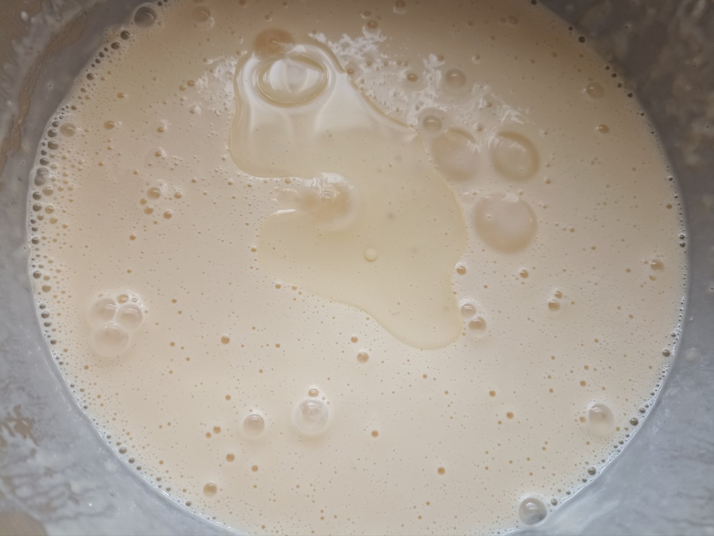 Муку просейте, чтобы насытить её кислородом. О свойствах муки читайте в конце рецепта. Муку частями насыпьте в миску с жидкими ингредиентами, перемешайте с помощью ручного венчика. Долейте оставшееся молоко и подсолнечное масло, перемешайте. Масло можно взять не только подсолнечное, но и оливковое, кукурузное или любое другое растительное масло, главное чтобы оно было рафинированное, без запаха. Подробнее о выборе масла читайте также конце рецепта.Шаг 5: