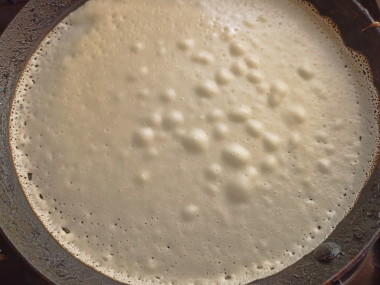 Разогрейте сковороду. Масло уже есть в тесте, поэтому сковороду с антипригарным покрытием можно вовсе не смазывать. Если же блины жарятся на сковороде без антипригарного покрытия, то можно добавить немного масла. Ориентируйтесь по своей сковороде. О сковородках подробнее читайте в конце рецепта. Налейте на сковороду тесто и равномерно распределите по всей поверхности. Жарьте блины на среднем огне по 1-2 минуте с каждой стороны.Шаг 6: