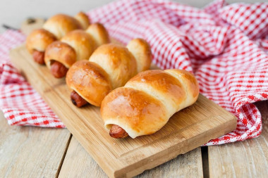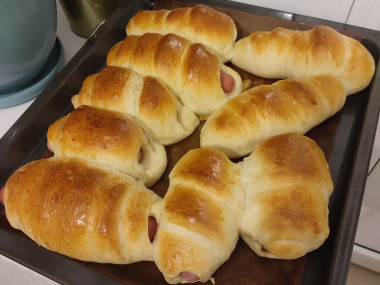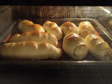 Спасибо за чудесный рецепт сосиски в дрожжевом тесте на кефире в духовке! Тесто готовила заранее, а сосиски запекала утром, чтобы успеть покормить домашних завтраком. Получилось супер! Боялась, что не сумею красиво завернуть длинные сосиски, поэтому брала короткие. Советую девочкам, как я, если опасаетесь, что не получится, пробуйте с короткими сосисками, их проще заворачивать!