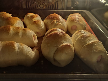 Ребëнок просто обожает сосиски в тесте, иногда покупаю ему в пекарне по соседству, а тут подумала а почему бы не испечь их самой. Облюбовала этот рецепт. Тесто поднялось раньше, чем за 1,5 часа, наверное, сразу и надо было приступать к раскатке, потому что изделия получились по итогу чересчур пышными, просто гигантскими, но очень вкусными :) Рецепт теста возьмëм на заметку, попробуем из него сделать хачапури ;)