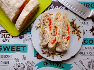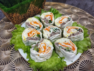 Лаваш со шпротами – очень интересная закуска. Прежде всего она удивляет своим необычным вкусом. Шпроты здесь очень похожи на консервированную сайру, но при этом привкус шпрот сохраняется. Все ингредиенты абсолютно идеально сочетаются друг с другом по вкусу. Очень вкусно, очень необычно.