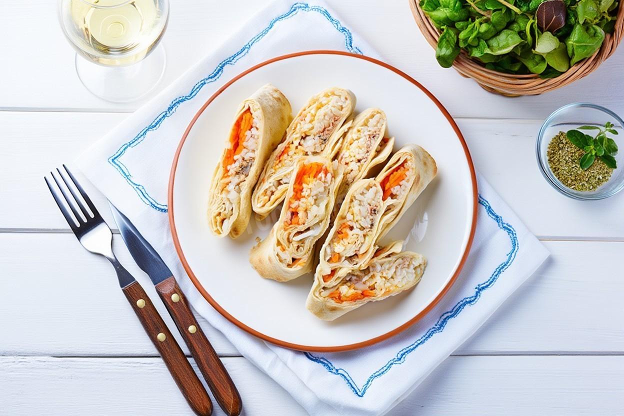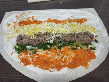 Выложите на краю лаваша полоску из лука, рядом выложите шпроты, потом рис, за ним яйца и морковь. Слои начинки кладите вплотную друг к другу.