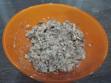 Разомните шпроты вилкой. При желании можно оставить рыбок целыми.