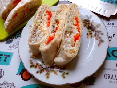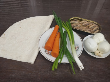 Лаваш со шпротами -быстрое,простое и очень вкусное блюдо,которое можно подать в качестве закуски. Так я и сделала,только репчатый лук заменила на зелёный и не добавляла рис. Морковь и яйца отварила и натерла на мелкой тёрке, шпроты размяла вилкой, лук мелко порезала. Чеснок измельчила и смешала с майонезом.