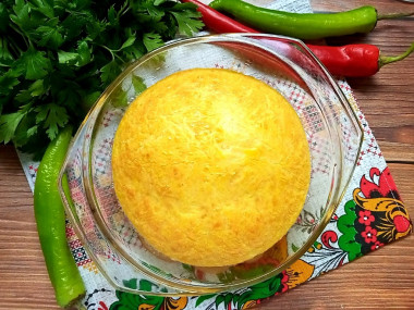 Яйца я взяла домашние с ярким желтком и омлет тоже получился ярко желтым. Сыр у меня костромской, он вкусный и хорошо плавится. Омлетную массу выложила в стеклянную форму диаметром 15 см. Выпекала 25 минут при 180°.