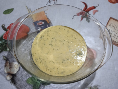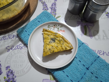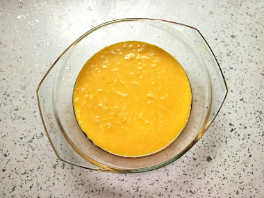 Форму для выпечки смажьте небольшим количеством растительного (или сливочного) масла. Вылейте в нее омлетную массу. У меня форма размером 22*17 см.
