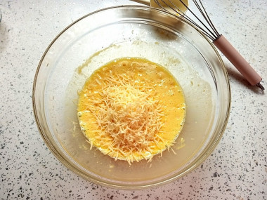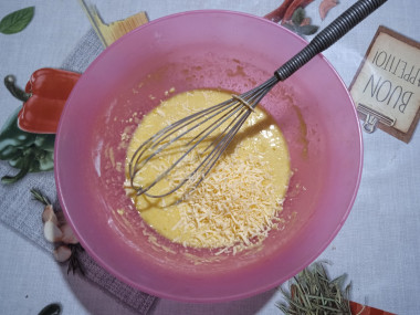 Всыпьте в яично-молочную массу натертый сыр. Вы также можете добавить на этом этапе любимые приправы и нарубленную зелень.