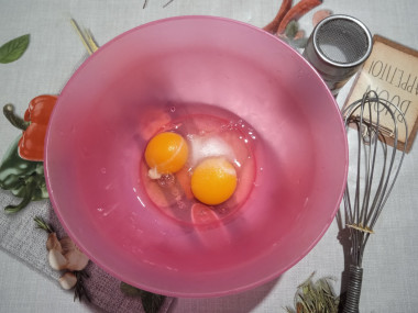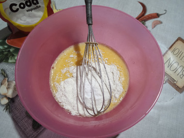 Вбейте яйца в глубокую миску. Добавьте соль, соду и муку. Влейте молоко.