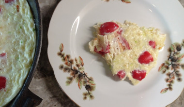 Омлет в духовке готовится дольше, чем на сковороде. Если обычно у меня уходит минут пять на его приготовление (без подготовки продуктов), то в духовке омлет запекался 25 минут (в чугунной сковороде). Но результат меня порадовал.