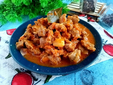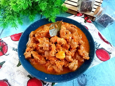 4. По истечении указанного времени добавляем томатную пасту, перец горошком, лавровый лист, солим по вкусу, доливаем воду (примерно 100 мл будет достаточно). Меняем режим на "Тушение", устанавливаем время приготовления 2 часа и 30 минут. На протяжении указанного времени пару раз заглядываем в чашу, если нужно - подливаем воду.