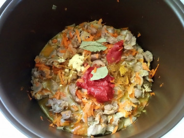 На мультиварке сразу установила режим "жарка" на 20 минут. Сначала обжарила овощи, затем добавила нарезанные желудочки. Желудочки до румяной корочки не обжарились, но верх "схватился". К концу программы выделилось достаточно много сока. Долила еще стакан кипятка, добавила лавровый лист, томат и специи. Из специй у меня овощная приправа, свежемолотый черный перец и много карри. Раз уж дети не едят желудочки, можно для себя и остренько сделать). Чеснока взяла 5 зубчиков, положила их целыми. Аромат во время тушения был потрясающий! В моей мультиварке максимальное время тушения 1,5 часа. Поэтому готовила в два этапа: сначала 1,5 часа и затем сразу еще 1 час.