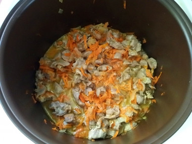 3. Растительное масло наливаем в чашу мультиварки, выбираем программу "Жарка", даем маслу подогреться, после чего выкладываем морковь, лук и чеснок. Обжариваем овощи в течение 8 минут, в процессе помешиваем. Затем добавляем куриные желудочки. Продолжаем жарить еще 7-8 минут.