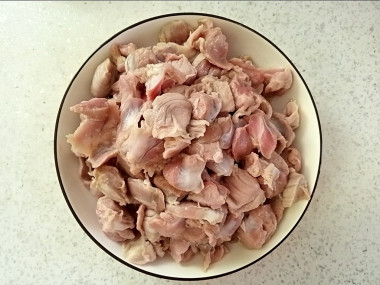 1. Куриные желудки выкладываем в миску, заливаем холодной водой, оставляем на час. По истечении указанного времени воду сливаем, с помощью ножа удаляем остатки желтой кожицы и жир, очищаем соринки. Подготовленные желудки моем, а затем нарезаем. Маленькие можно оставить целыми, а те что побольше разрезать на две - три части.