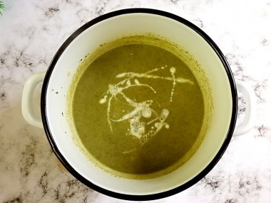 Суп хорошенько измельчите погружным блендером до однородного пюре и гладкости.