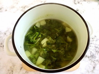 В кастрюле вскипятите 1 л воды, выложите картофель и брокколи. Все посолите и перемешайте. Доведите воду до кипения и варите суп на среднем огне примерно 10 минут.