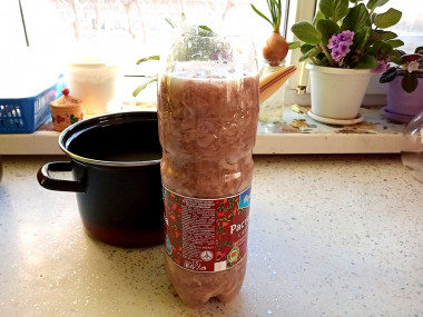 9. У пластиковой бутылки срезаем горлышко, наполняем ее мясом и заливаем бульоном. Размещаем бутылку в холодильнике, лучше если это будет нижняя полка. Оставляем на ночь, но может понадобится и больше времени, примерно 10-15 часов.