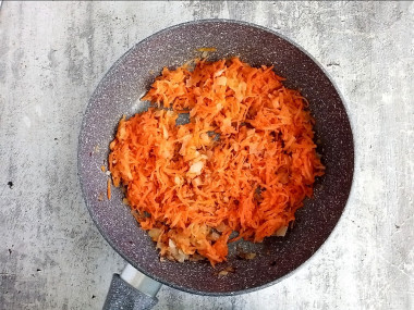На горячую сковороду налейте немного растительного масла и обжарьте морковь с луком 1-2 минуты на небольшом огне. Овощи станут мягче.
