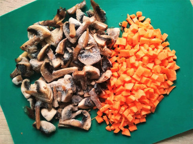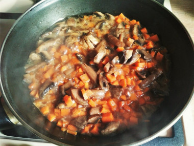 Шампиньоны у меня были замороженные и нарезаны мелко. Поэтому готовое блюдо получилось однородной консистенции. Грибов было много и их вкус и аромат хорошо чувствуется. У меня шампиньоны лесные, они выделяют темный сок, который окрасил даже морковку. Белые магазинные грибы получатся гораздо светлее.