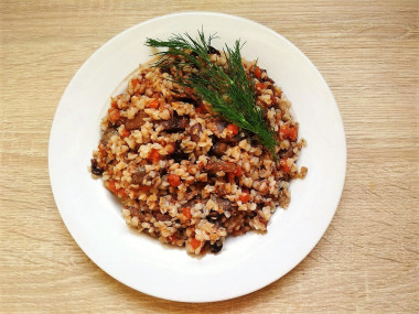 Снимите сковороду с огня. Разложите гречку с шампиньонами, луком и морковью по тарелкам и подавайте к столу в горячем виде. Приятного аппетита!