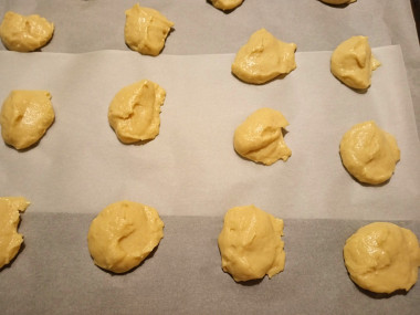 Противень застелите пергаментом или смажьте растительным маслом. Ложкой выложите тесто на противень небольшими комочками, оставляя место между печеньями - при выпечки оно немного увеличится в размере. Если печенье расползается, добавьте ещё муки. Выпекайте печенье при 160-180 градусов около 20 минут. Я пекла при 180С. Точные время и температура зависят от особенностей вашей духовки. Сырое тесто жидковатое, поэтому его можно выпекать в формочках от кексом