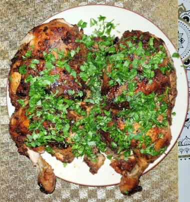 Обожаем такую курочку! Только я готовлю ее до полной готовности под прессом и не подтушиваю! А при подаче заливаю соусом из растопленного сливочного масла, воды, чеснока, специй и зелени кинзы!