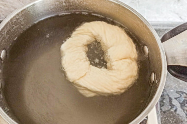 Доведите до кипения воду в сотейнике. Всыпьте соду. Будьте аккуратны — начнется сильное бурление. Опустите в кипящую воду заготовку булочки. Проварите ее 30-40 секунд, переворачивая ложкой.