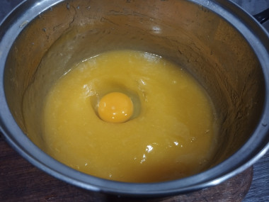 В тыквенное пюре вбейте куриное яйцо. Обязательно мойте яйца перед использованием, так как даже на кажущейся чистой скорлупе могут находиться вредные бактерии. Лучше всего использовать моющие средства для пищевых продуктов и щетку.