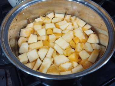 Тыкву, нарезанную кубиками, залейте небольшим количеством воды и проварите до мягкости на небольшом огне. В процессе всыпьте в тыкву сахар. Его количество можете регулировать по своему вкусу. Если тыква десертных сладких сортов, сахар можно не добавлять вовсе.