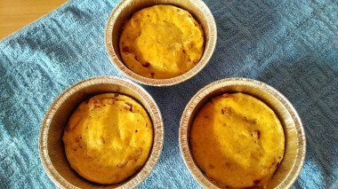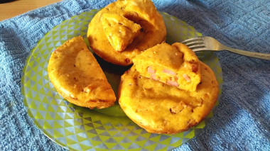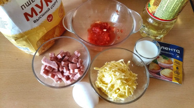 Еще одна вкусняшка к чаю или кофе - маффины с ветчиной. Приготовила все продукты, перемешала в миске яйцо, сыр, ветчину, муку, разрыхлитель и специи. Жаль что не было оливок и вяленых помидор, но я заменила солеными помидорами. И добавила карри, на мой взгляд вкусные приправы в такой выпечке только к месту. Формочки для маффинов я взяла в этот раз алюминиевые широкие, а теста приготовила немного, все ингредиенты разделила на 3, из расчета на одно яйцо. Тесто получилось густое, формочки поставила в разогретую духовку, и уже через некоторое время по всей квартире пахло очень вкусно, как будто печется пицца, чувствовался аромат и колбаски, и сыра. Готовые маффины похожи на мини-пироги, на одну порцию, в разрезе рыхлые, а сверху корочка. если после выпечки подержать минут 10 под полотенцем, становятся очень мягкими. Вкусно и с чаем, и с молоком. Благодарю за рецепт.