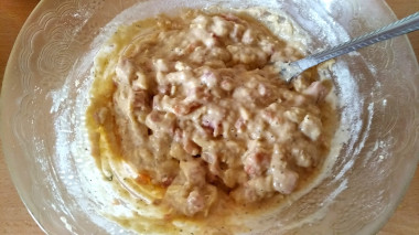 Теперь будем готовить тесто. Для этого молоко переливаем в миску, туда же разбиваем яйца. Наливаем оливковое масло и все вместе взбиваем венчиком до однородности.Просеиваем муку, насыпаем разрыхлитель, щепотку соли, черный молотый перец по вкусу. Все снова хорошенько перемешиваем (можно воспользоваться миксером).