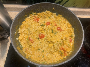 Решили в итоге замешать с рисом, чтобы он пропитался этим чудесным соусом. Как раз вышло отлично - 160 гр. сухого риса на это количество карри. Получился такой вариант, типа карри-плов.