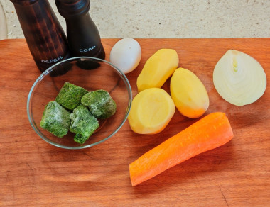 В бульон с морковью сбросить картошку и когда она будет полностью готова, сбросить лук, нарезанный шпинат, по вкусу посолить и поперчить черным молотым перчиком.