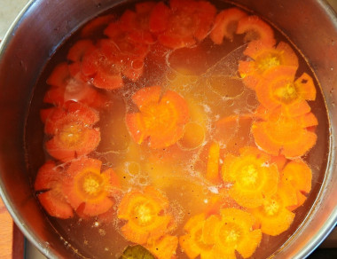 Поставить на огонь кастрюльку с куриным бульоном, (но можно использовать любой другой бульон, на ваше усмотрение. Сбросить в него морковь и варить почти до полной готовности моркови.