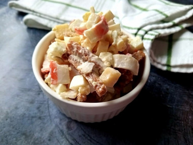 Моей семье понравился вкусный салат с сухариками королевский. На его приготовление понадобилось всего несколько минут. Сухарики определяют вкус всего салата. Раз уж в его состав входят крабовые палочки, то сухарики взяла со вкусом краба, это отличное сочетание. Сыр у меня Маасдам, у него специфический вкус, который хорошо подходит к "крабам" на мой взгляд. Петрушку я не добавляла, т. к. не все едят зелень. После заправки майонезом дала настояться пару часов в холодильнике. Прекрасный салат, вкусный, сытный, хрустящий!