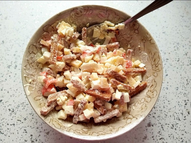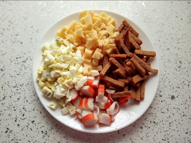 В салатнике соединить крабовые палочки, яйца, сыр и сухарики.