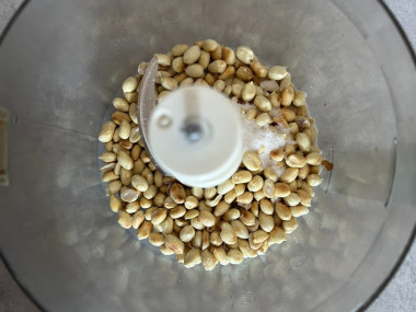 В чашу блендера или кухонного комбайна выложите очищенный арахис, всыпьте сахар и соль (у меня блендер маленький, поэтому я выложила половину) и начните взбивать.