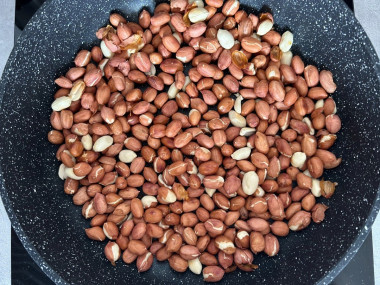 Увидела этот рецепт и вспомнила про арахис, который давно лежал и ждал своего часа. Обжаривала его на сковороде маленькими партиями. Давольно-таки быстро получилось. Шелуху с орешков помогал снимать сын. Их количество на этой стадии слегка уменьшилось)))