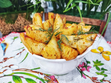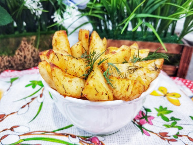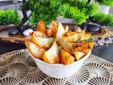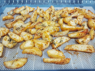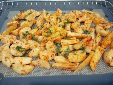Посыпала ломтики картофеля и перемешала. Выложила картофель на силиконовый коврик, немного посыпала измельчённым укропом и запекала в духовке при 180° 20 минут.